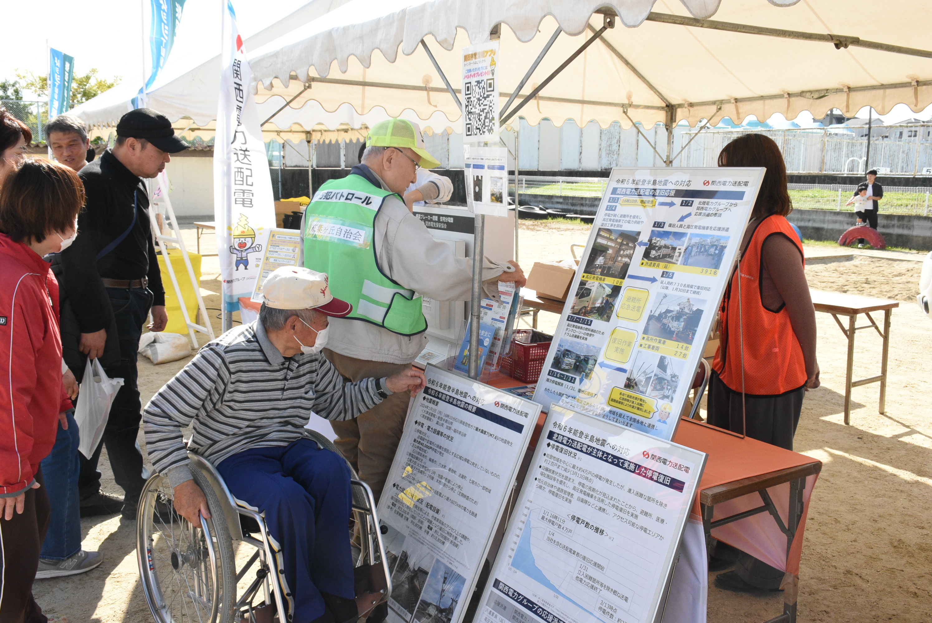 当日は、消防ポンプ車、機動隊車両などの緊急車両の展示、自衛隊車両への乗車体験、防災クイズ大会、関西電力送配電による災害時の電線復旧のデモンストレーションなどが行われ、約500名の方にご来場いただき、楽しく防災について学んでいただきました。