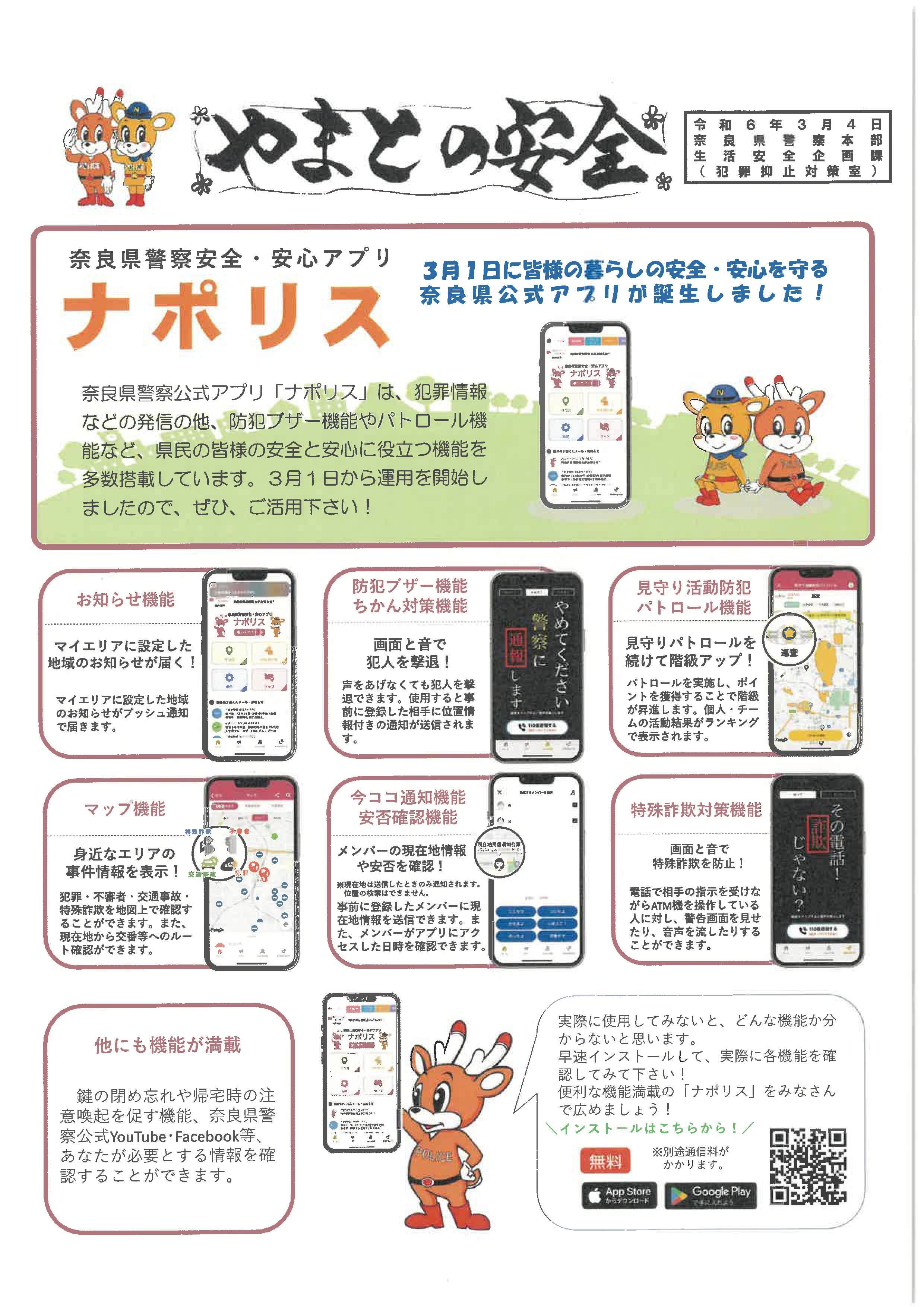 奈良県警察安全・安心アプリ「ナポリス」が、令和6年3月1日より運用開始となりました。