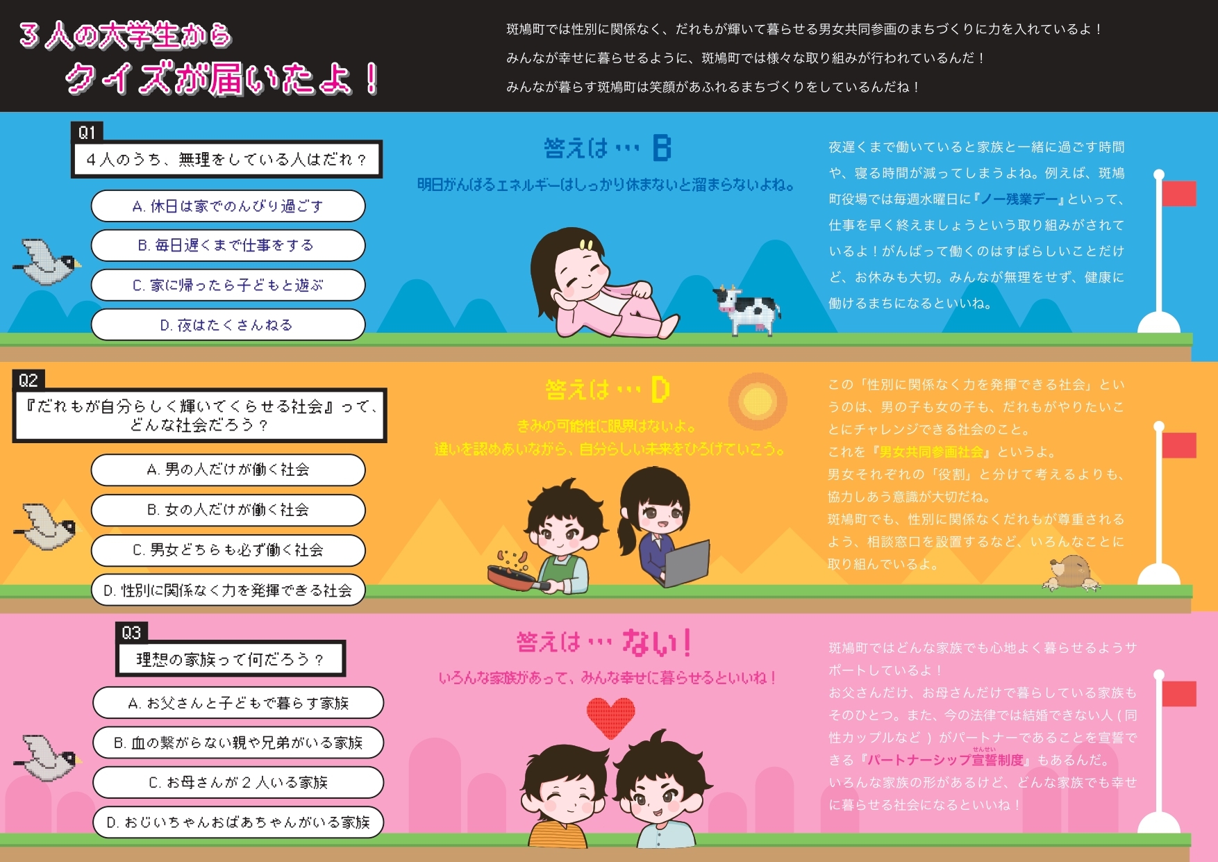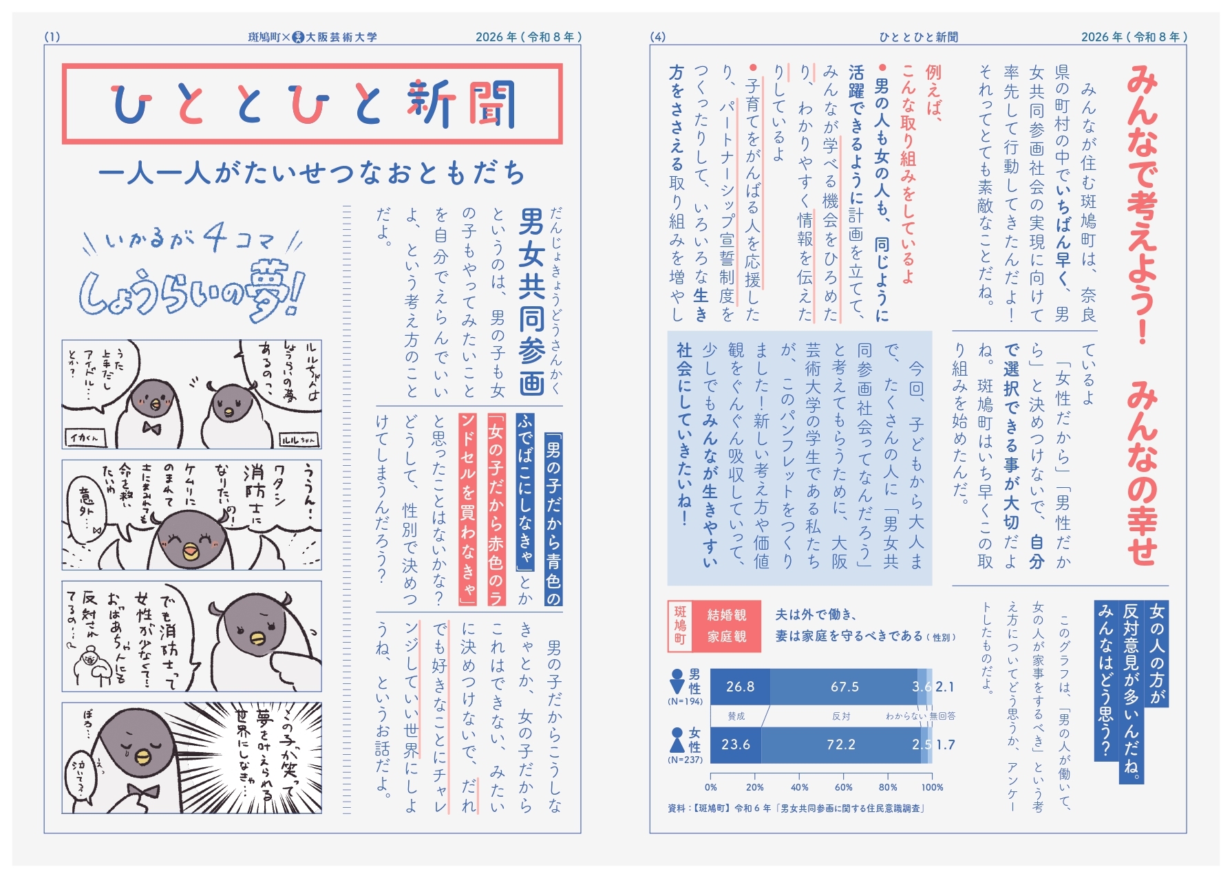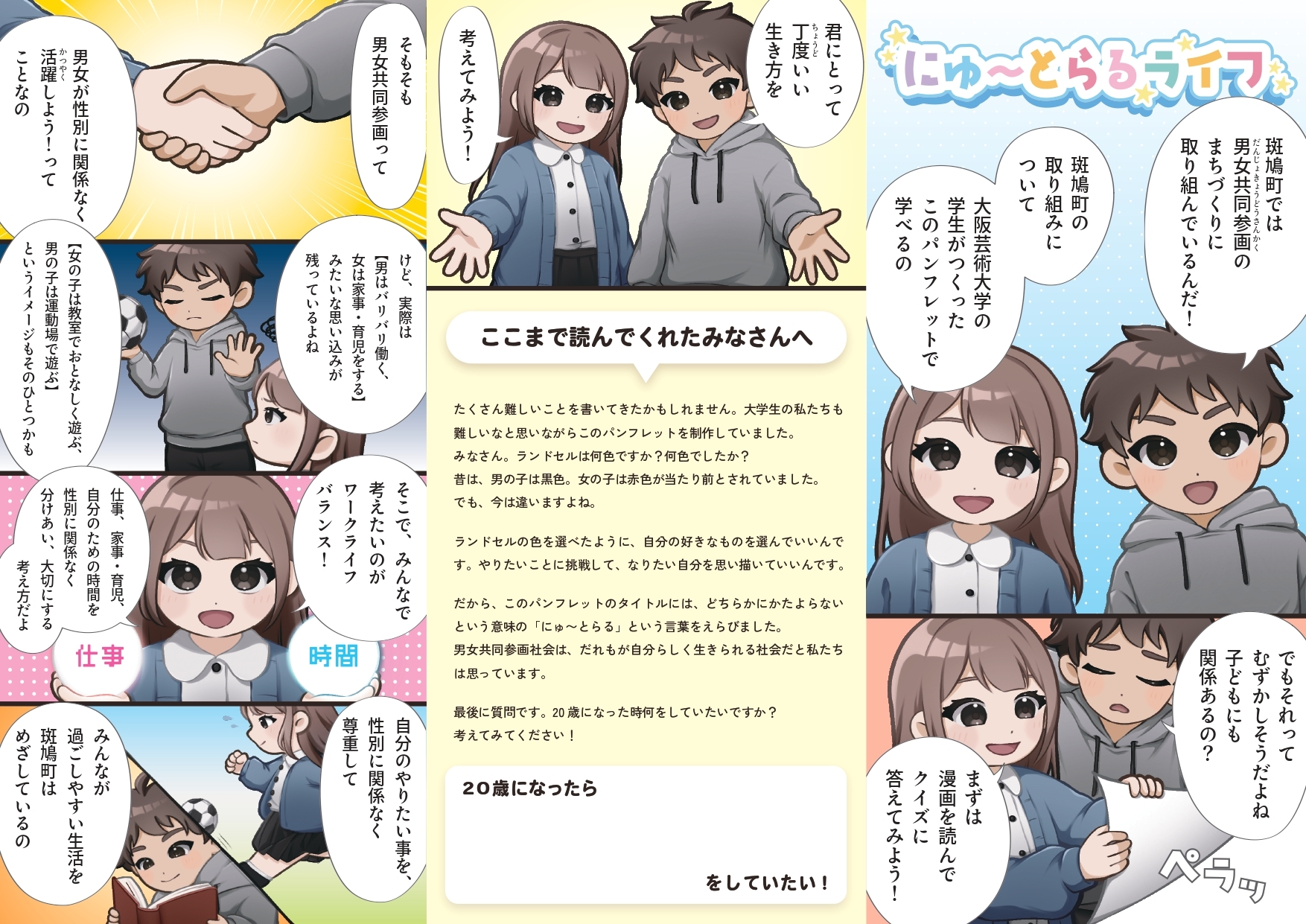 斑鳩町では、「男女共同参画」や「ワーク・ライフ・バランス」を進めるため、官学連携協定を締結している大阪芸術大学の学生と連携して、ワーク・ライフ・バランスを周知し、子どもから大人まで意識し考えるきっかけにつながるリーフレットを作成しました。