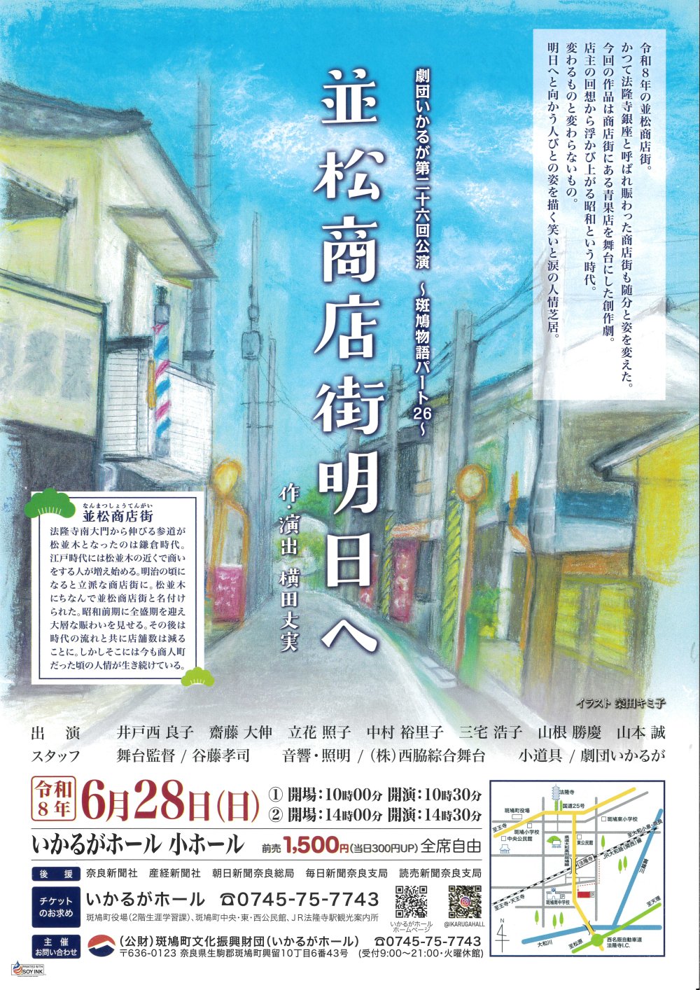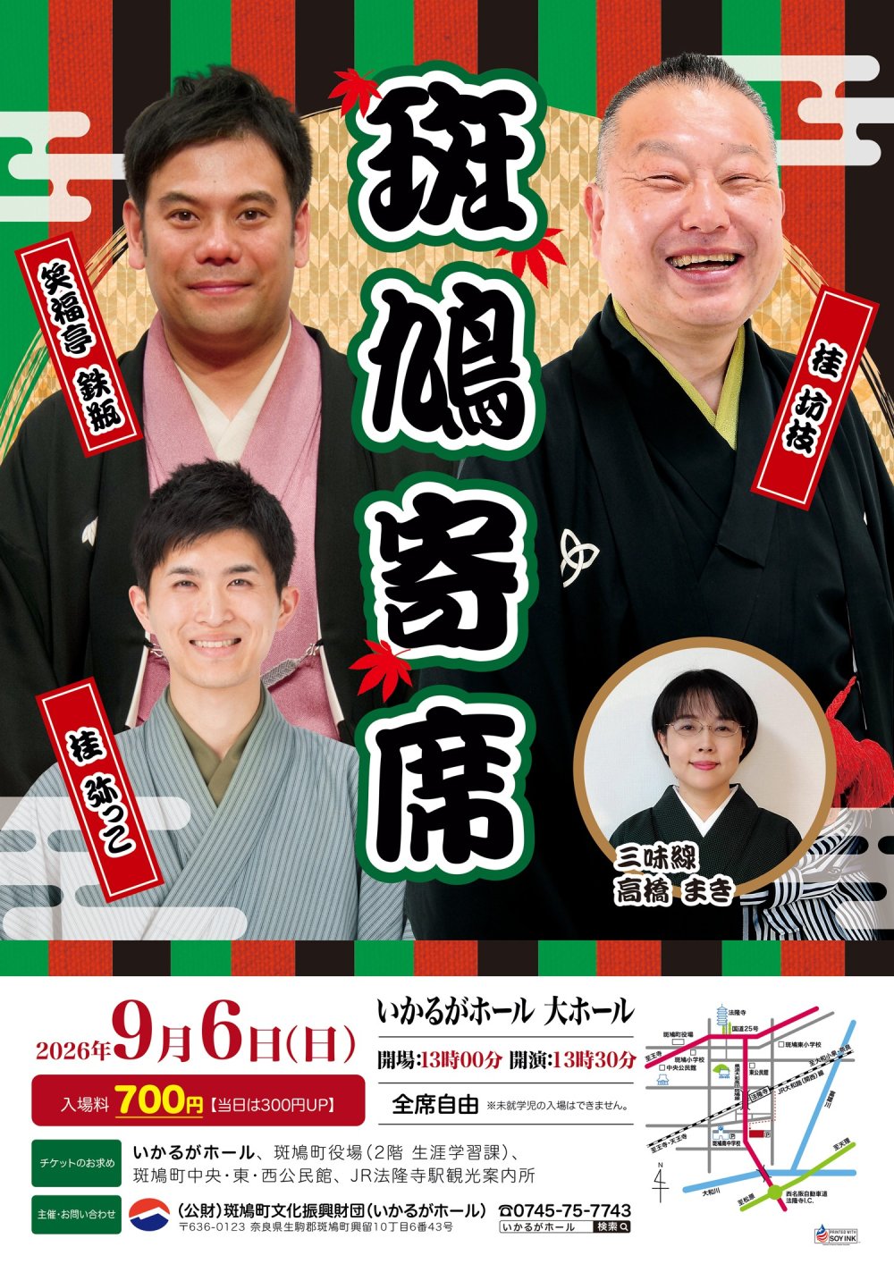 イベント情報 EVENT 2026.04.18 クラシック 奈良フィルハーモニー管弦楽団 創立40周年 第58回 定期演奏会 開場13:30 開演14:00 会場いかるがホール 大ホール 主催特定非営利活動法人 奈良フィルハーモニー管弦楽団 2026.06.20 映画 映画上映会「てっぺんの向こうにあなたがいる」 開場①9:30 ②13:30 開演①10:00 ②14:00 (カラー130分) 会場いかるがホール 大ホール 全席自由 (各回入替制) 主催(公財)斑鳩町文化振興財団・株式会社グループ未来 2026.06.28 演劇 劇団いかるが第二十六回公演 『並松商店街明日へ』 開場①10:00 ②14:00 開演①10:30 ②14:30 会場いかるがホール 2階 小ホール 主催(公財)斑鳩町文化振興財団 2026.09.06 伝統芸能 斑鳩寄席 ~笑う門には福来る~ 開場13:00 開演13:30 会場いかるがホール 大ホール 主催(公財)斑鳩町文化振興財団 もっと見る