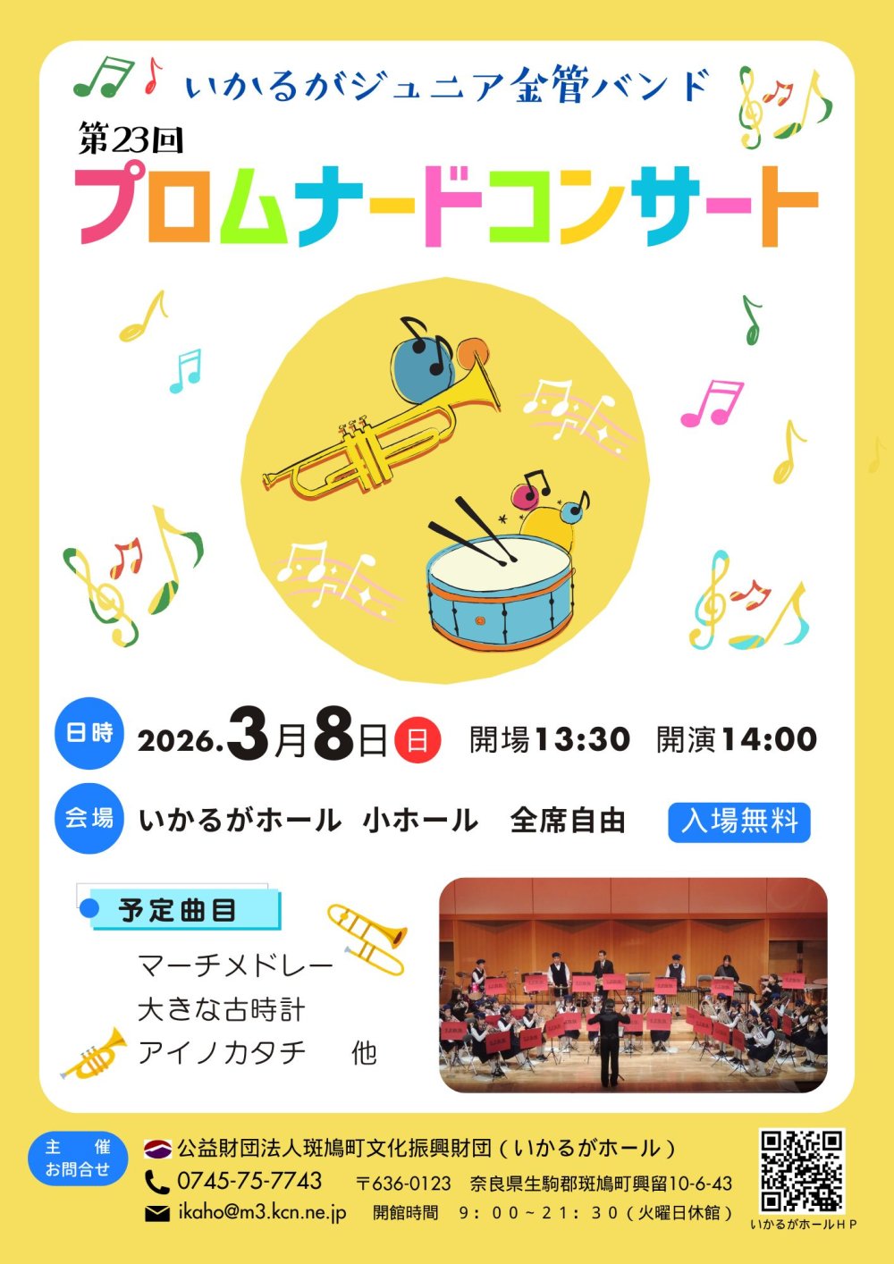 今月号のステージあらかると(PDF) 2025.12.20 合唱 Peace Concert in NARA 2025被爆・戦後80年 記憶を紡ぎ 未来をひらこう 開場13:30 開演14:00 会場いかるがホール 大ホール 主催Peace Concert in NARA 2025実行委員会 2026.01.25 伝統芸能 斑鳩寄席 ~笑う門には福来る~ 開場13:00 開演13:30 会場いかるがホール 大ホール 主催 (公財)斑鳩町文化振興財団 2026.02.15 邦楽 舞太鼓あすか組コンサート with 和太鼓いかるが 開場13:00 開演13:30 会場いかるがホール 大ホール 主催(公財)斑鳩町文化振興財団 2026.03.07 映画 映画上映会「九十歳。何がめでたい」 開場①9:30 ②13:30 開演①10:00 ②14:00 (カラー99分) 会場いかるがホール 大ホール 全席自由 (各回入替制) 主催 (公財)斑鳩町文化振興財団・株式会社グループ未来 2026.03.08 室内楽 第23回 プロムナードコンサート 開場13:30 開演14:00 会場いかるがホール 小ホール 主催(公財)斑鳩町文化振興財団 友の会のご案内