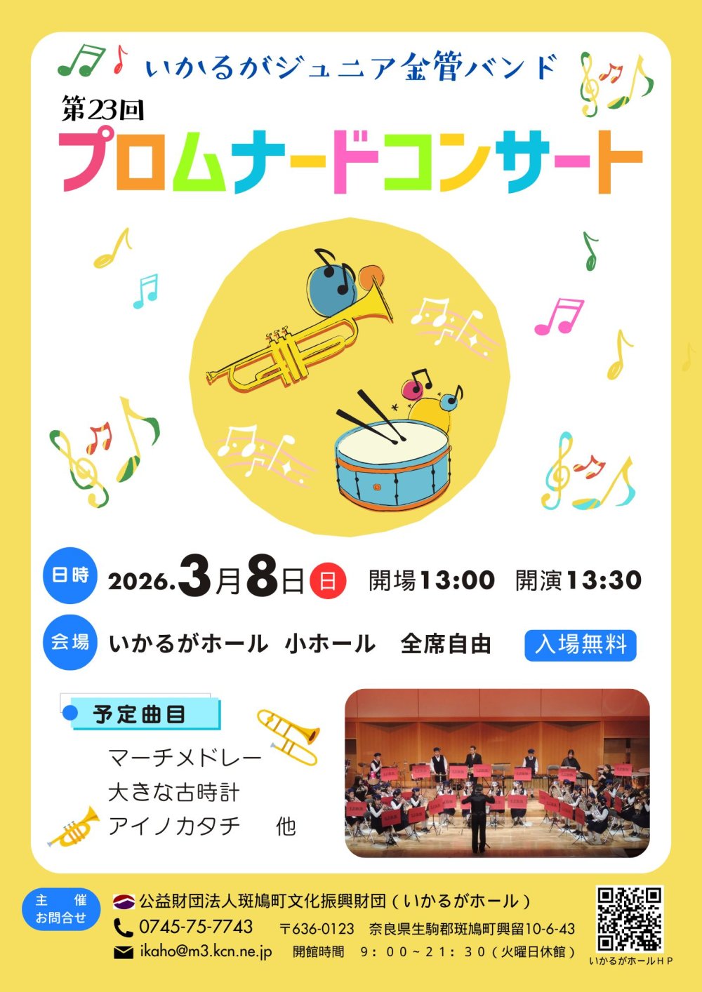 今月号のステージあらかると(PDF) 2026.01.25 伝統芸能 斑鳩寄席 ~笑う門には福来る~ 開場13:00 開演13:30 会場いかるがホール 大ホール 主催 (公財)斑鳩町文化振興財団 2026.02.15 邦楽 舞太鼓あすか組コンサート with 和太鼓いかるが 開場13:00 開演13:30 会場いかるがホール 大ホール 主催(公財)斑鳩町文化振興財団 2026.03.07 映画 映画上映会「九十歳。何がめでたい」 開場①9:30 ②13:30 開演①10:00 ②14:00 (カラー99分) 会場いかるがホール 大ホール 全席自由 (各回入替制) 主催 (公財)斑鳩町文化振興財団・株式会社グループ未来 2026.03.08 室内楽 第23回 プロムナードコンサート 開場13:30 開演14:00 会場いかるがホール 小ホール 主催(公財)斑鳩町文化振興財団 友の会のご案内