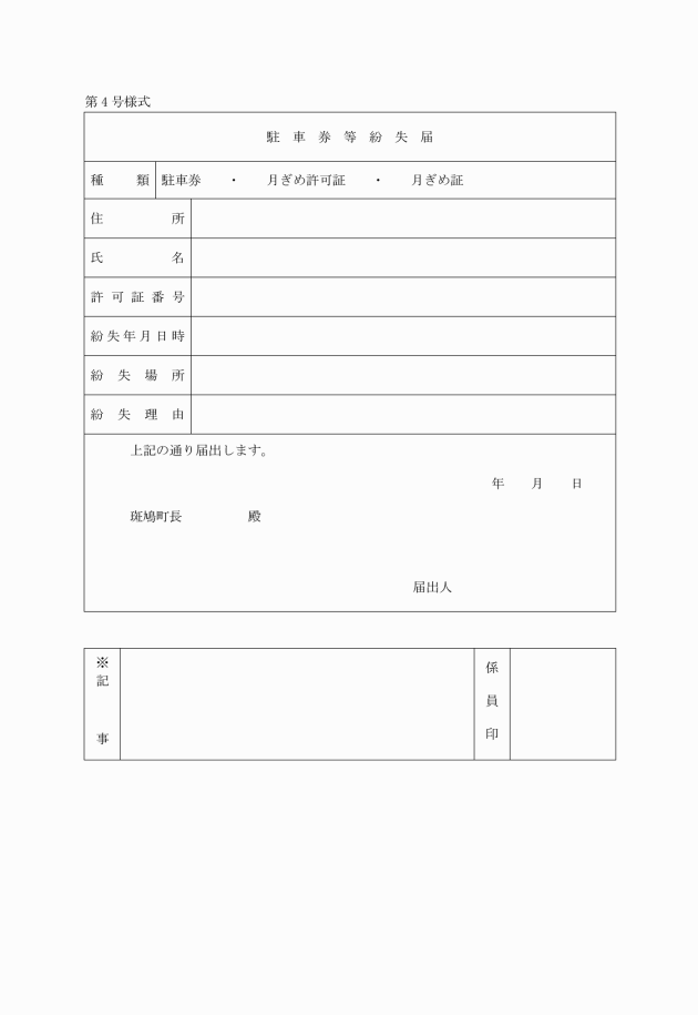 第4条 使用者が駐車券及び月ぎめ許可証を紛失したときは、ただちに駐車券等紛失届(第4号様式)を町長に提出しなければならない。