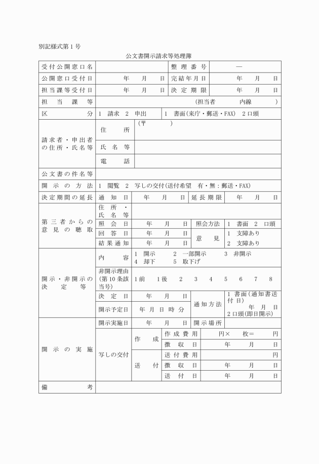 必要事項が記載され、対象公文書が特定できれば、所定の様式でなくても、受け付けるものとする。なお、主管課に直接到達したときは、いつたん総合公開窓口に送付するものとする。