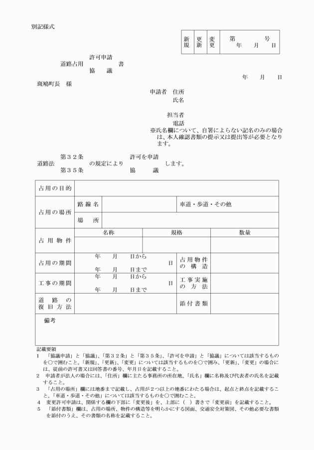 第2条 道路法第32条の規定により道路の占用許可を受けようとする者は、法令に特別の規定あるもののほかこの規則により別記様式の申請書に次の図面を添え、町長に提出しなければならない。