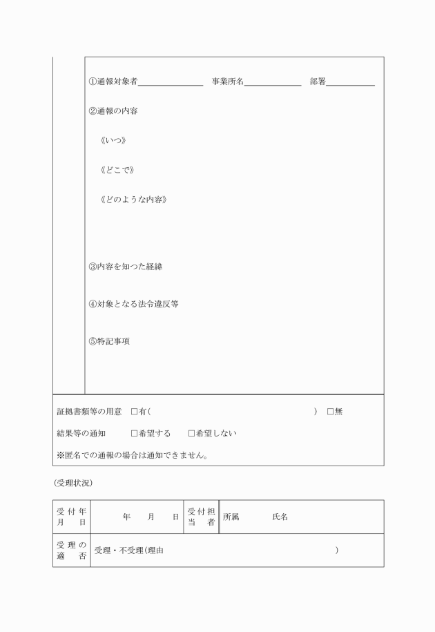 2 職員等は、公益通報を行うときは、原則として公益通報書(様式第1号)により行うものとする。ただし、相談員に対して公益通報を行う場合は、封書又はFAXに限る。
