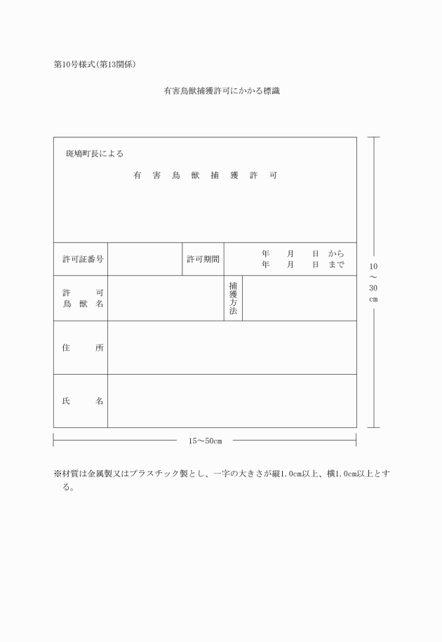 (4) 網又はわな(捕獲柵、捕獲檻を含む。)を使用するときは、1張又は1個ごとに許可を受けた者の住所、氏名、許可証番号、許可期間及び許可鳥獣名等を記載した標識(第10号様式)を明示するとともに、それぞれの網又はわなを適切に管理すること。