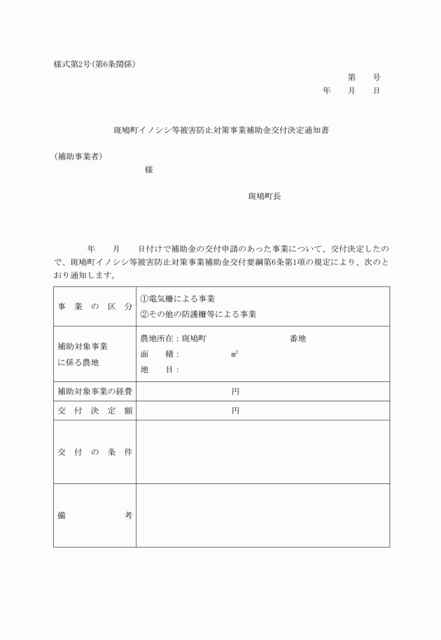 2 町長は、内容変更申請の提出があつたときは、その内容を審査するとともに、適当と認めるときは速やかに斑鳩町イノシシ等被害防止対策事業内容変更決定通知書(様式第4号)により申請者に通知するものとする。