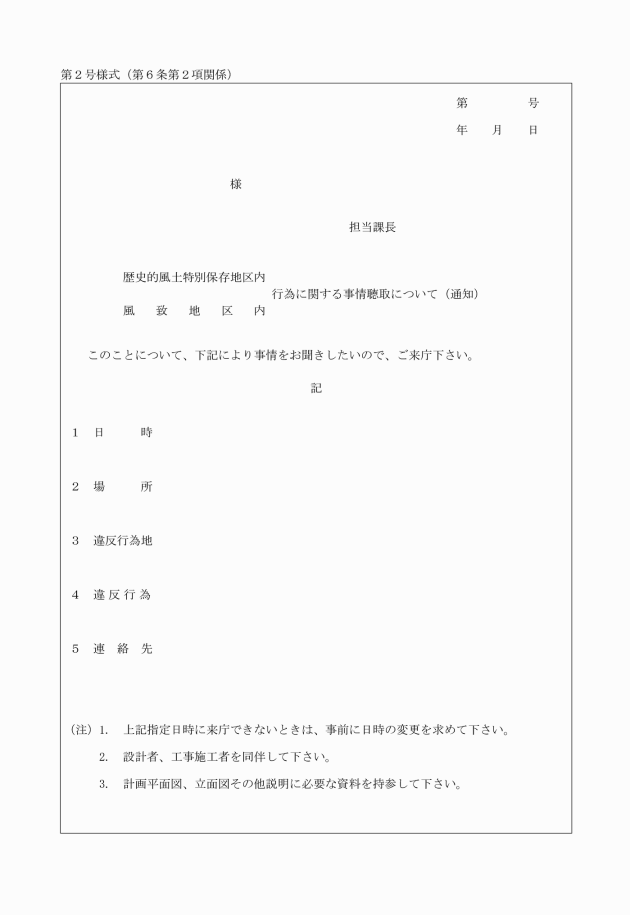 2 関係人に対して来庁を求めて事情聴取を行う場合は、事情聴取通知書(第2号様式)により通知するものとする。なお、代理人が来庁する場合は、委任状の提出を求めるものとする。