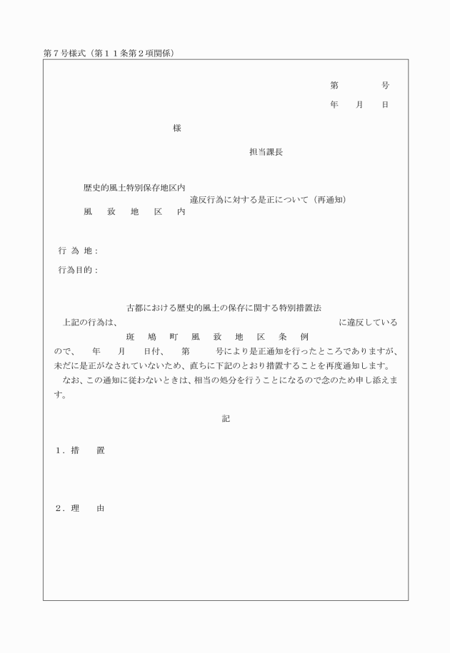 2 是正通知後、措置内容ごとに相当する期間を経過してもなお是正されない場合には、再通知書(第7号様式)により、再度通知するものとする。