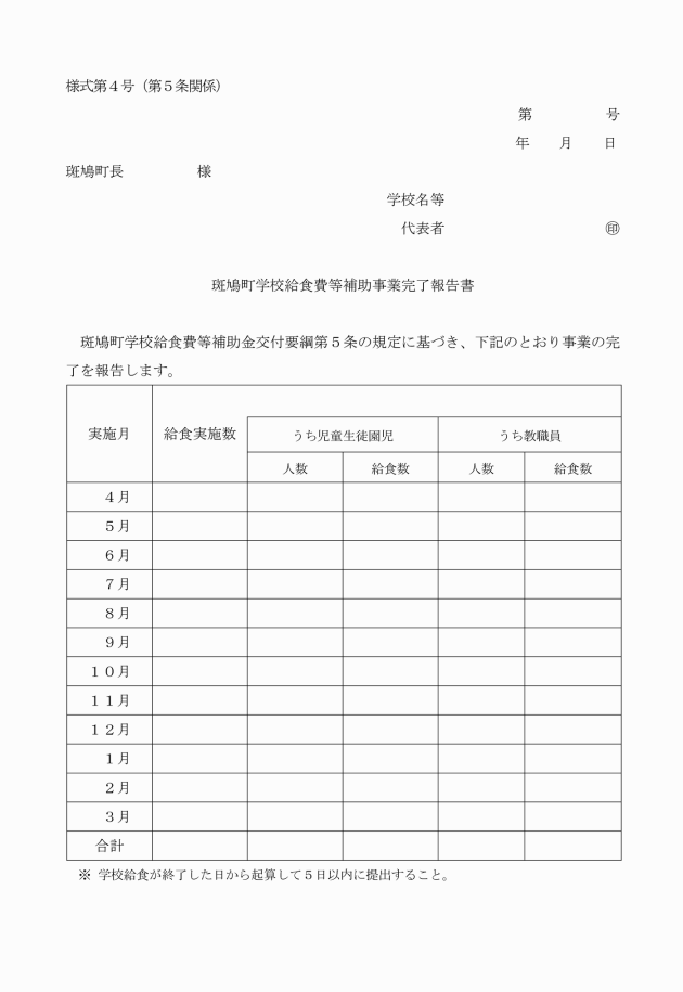 5 補助金の概算払いを受けた代表者は、学校給食の終了した日から起算して5日以内に、斑鳩町学校給食費等補助金概算払精算書(様式第9号)を提出しなければならない。