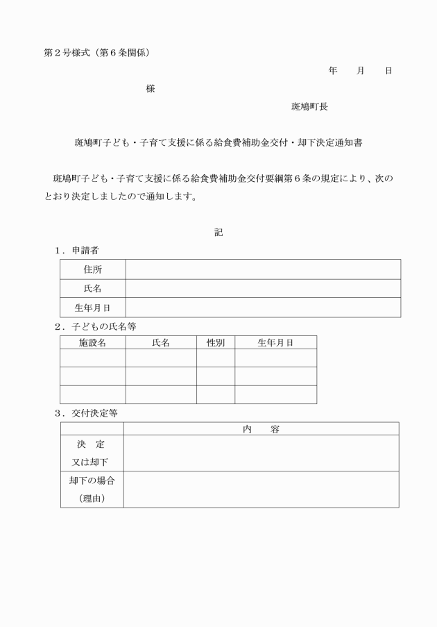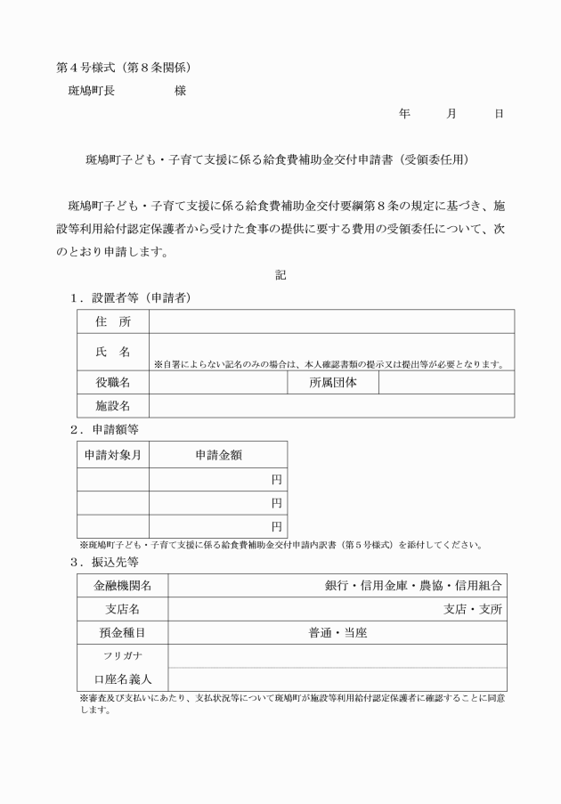 第5条 補助金の交付を受けようとする施設等利用給付認定保護者は、斑鳩町子ども・子育て支援に係る給食費補助金交付申請書(第1号様式)を、町長に提出しなければならない。